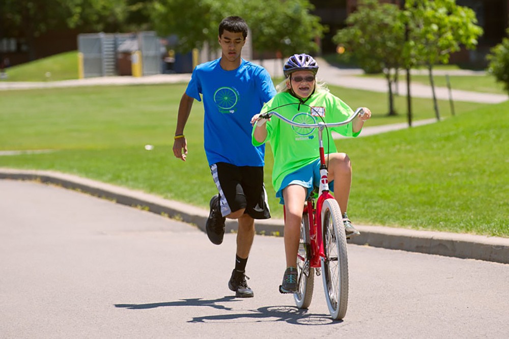Ten-year-old Montana Rooksby takes off on a bike with volunteer Shaan Bhamra during the annual AutismUp iCan Bike Camp, held July 13-17 at the Gordon Field House. The camp teaches individuals with Autism Spectrum Disorder and other disabilities how to ride a conventional bike without training wheels. -