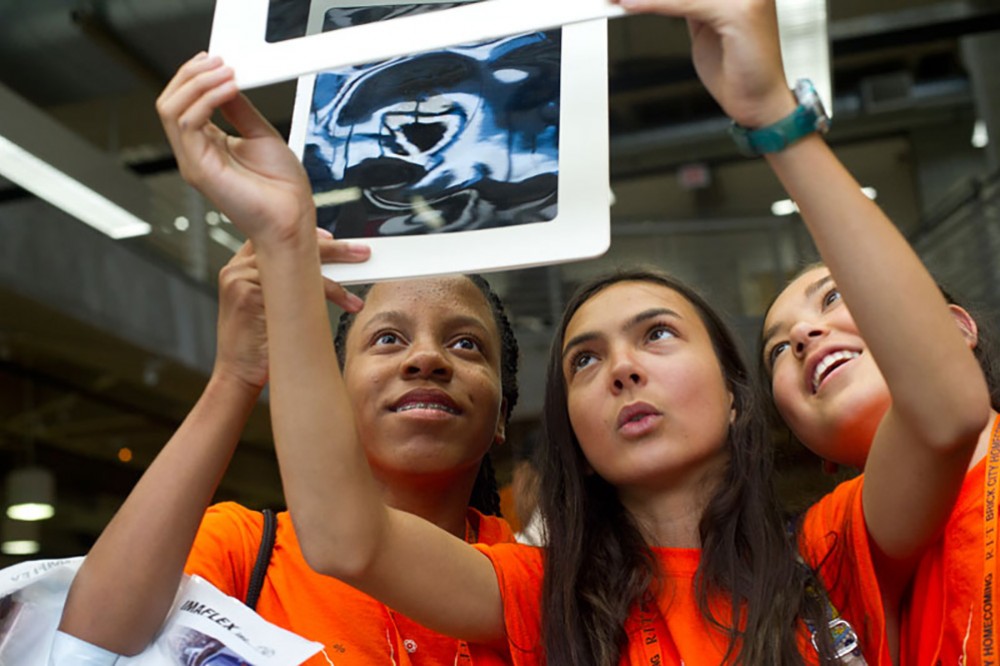 The Summer Math Applications in Science with Hands-on (SMASH) Experience for Girls held at RIT the week of July 13 broke barriers to mathematics that often keep girls from entering STEM fields. From left, eighth-graders Morgan Hardy, Sarah Winfree and Mia Vena look through polarizing films during a hands-on activity. -
