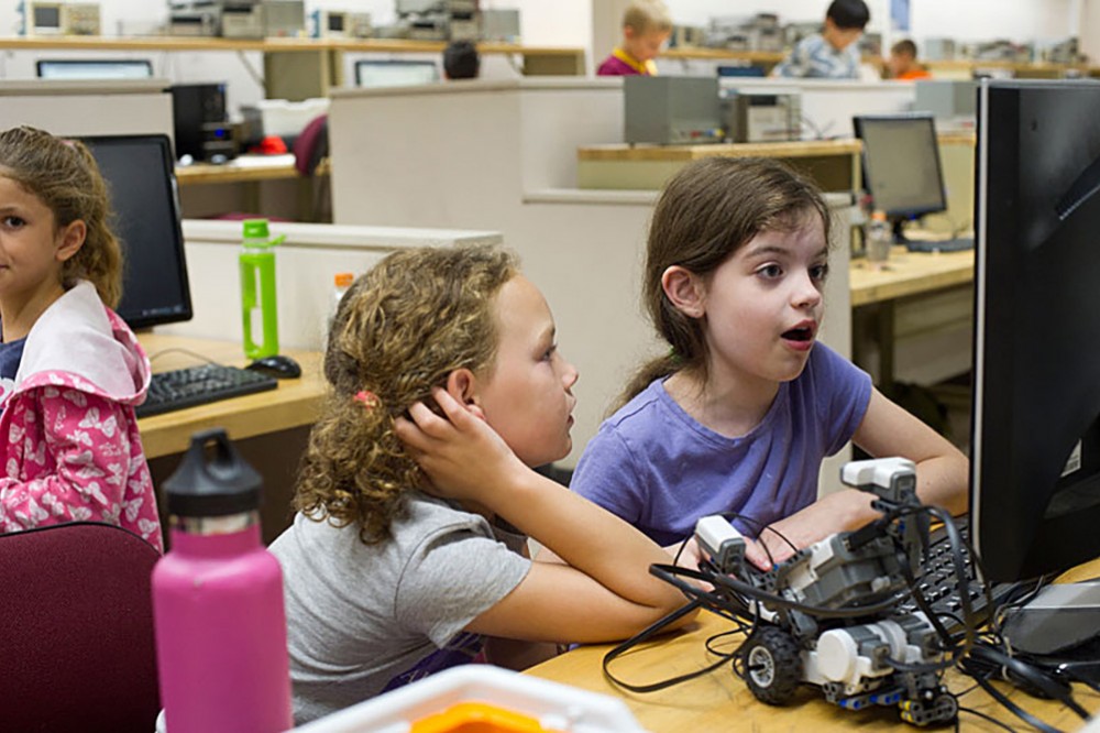 Eight-year-old Kendall Smith of Pittsford, N.Y., left, and 9-year-old Eve Miller of Utica, N.Y., work on programming their robot at RoboCamp @ RIT. The weeklong day camp lets students design, build and program robots. This camp is enriched with mini-projects and goals that promote teamwork and creativity. Along with the mini-projects, instructors teach the students some of the fundamental aspects of robotics and programming. -