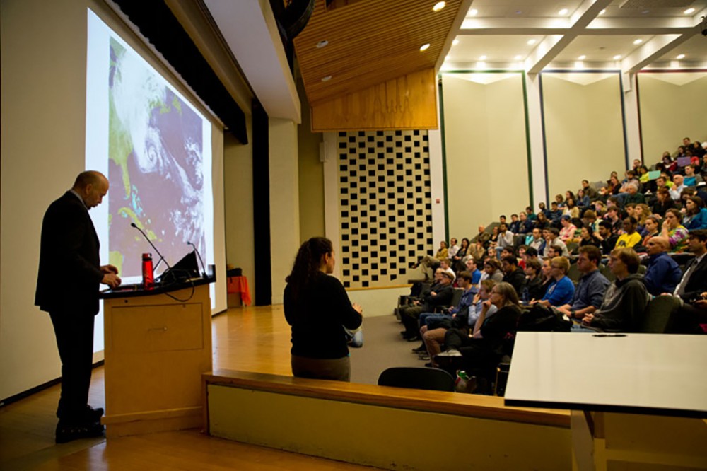 Climate scientist and activist James Hansen talked to the RIT community on April 21 about sea level rise and superstorms, and the dangers of global warming. Hansen, a former director of NASAâs Goddard Institute for Space Studies, testified in 1988 before Congress about fossil fuels and carbon dioxide emissions contributing to the greenhouse effect. He was in Rochester for a public presentation, sponsored by the Sierra Club Rochester Regional Group, RIT and other local organizations. -
