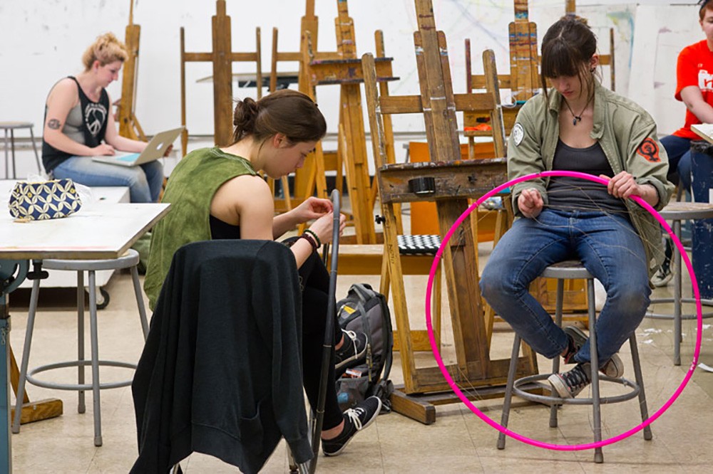 Second-year fine art students Sydney DeBruyn and Madeleine Jason, right, work on their portion of an interactive art installation. Nearly 20 students are contributing to the project âSpace Invadersâ that will debut at the Imagine RIT: Innovation and Creativity Festival on May 2. -