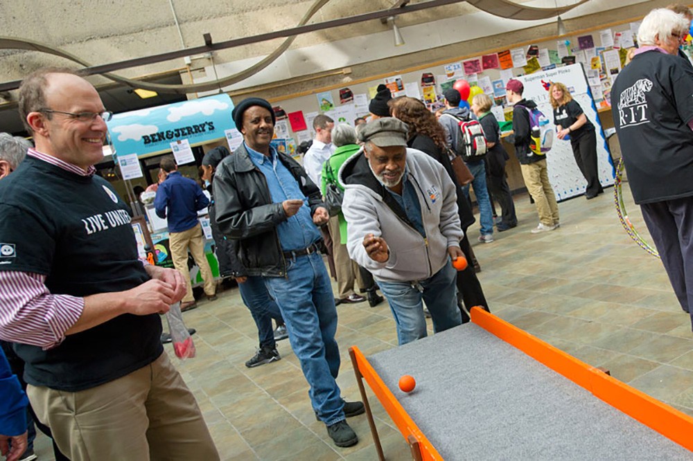 RITâs 2015 United Way campaign kicked off March 11 with the Heroes in Action and Auction event. Activities included games, celebrity ice cream scoopers and a prize auction. Here, Willy Davis, right, plays Batcave Skeeball with Demelash Alemu, both from Facilities Management Services. Daniel Stafford, left, assistant dean for academic services in the B. Thomas Golisano College of Computing and Information Sciences, looks on. Pledges can be made online at rit.edu/unitedway.