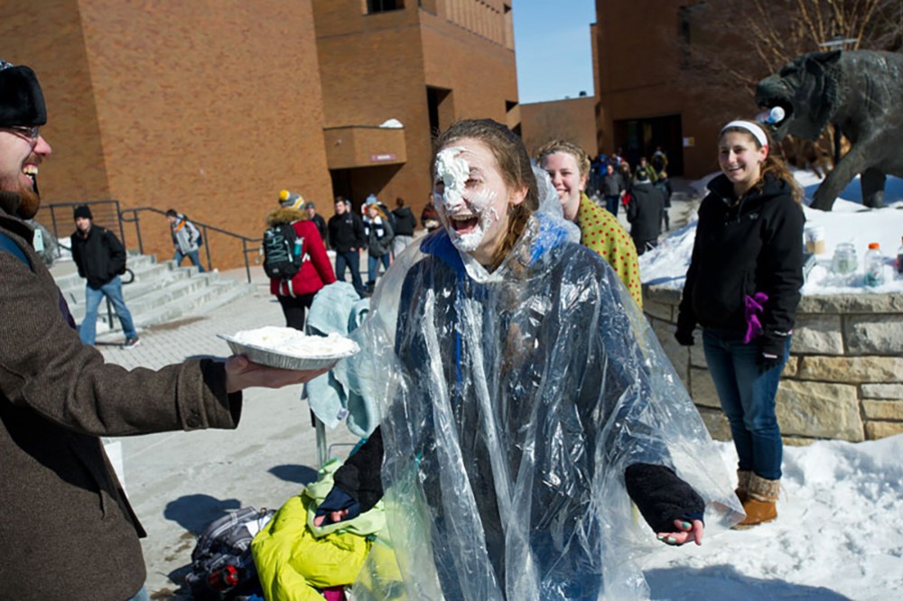 Fourth-year journalism students Will Hirsh and Joan McDonough participated in a pie-throwing fundraiser for Encore. The all-female a cappella group is having their annual concert, Bellacappella, on March 14 at 8 p.m. in Webb Auditorium. -