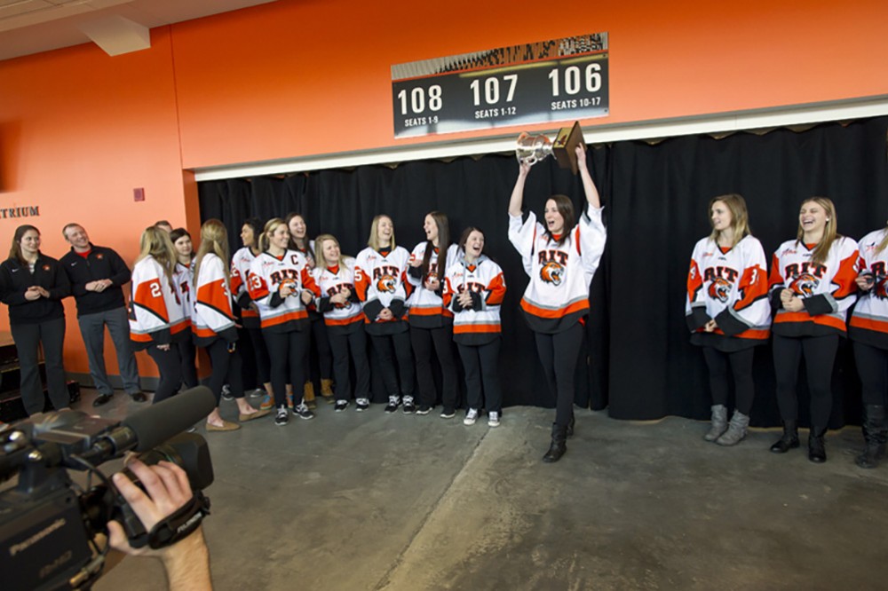 The RIT womenâs hockey team advanced to the NCAA Division I Tournament for the first time as a Division I opponent. The RIT community held a celebratory send-off with the Pep Band, RITchie, speakers and cake. Goalie Ali Binnington is seen here hoisting the College Hockey America championship trophy. The team will play at top-seed University of Minnesota on March 14 in the National Quarterfinals at 5 p.m. -