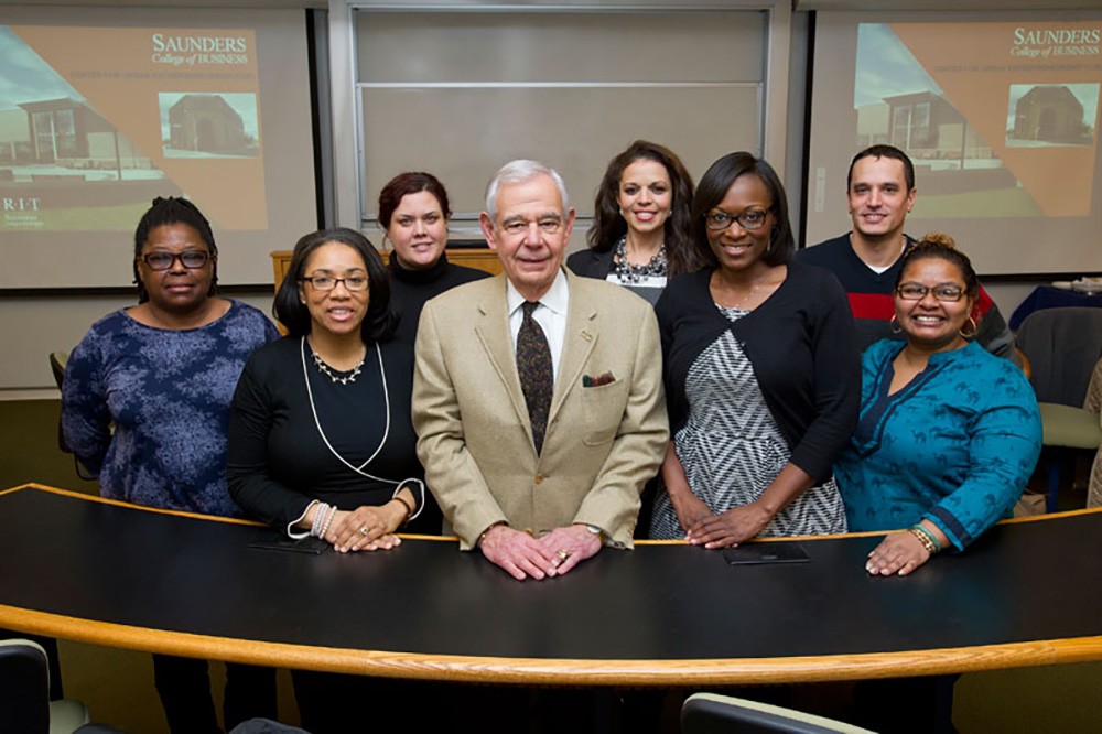 The second cohort of graduates of RITâs Center for Urban Entrepreneurship at Saunders College of Business are six local entrepreneurs who have spent the last six months in a customized training program to grow their business. CUE Interim Director Carlos Carballada and CUE Program Manager Ebony Miller (to his right) presented participants with RIT certificates during the ceremony. -