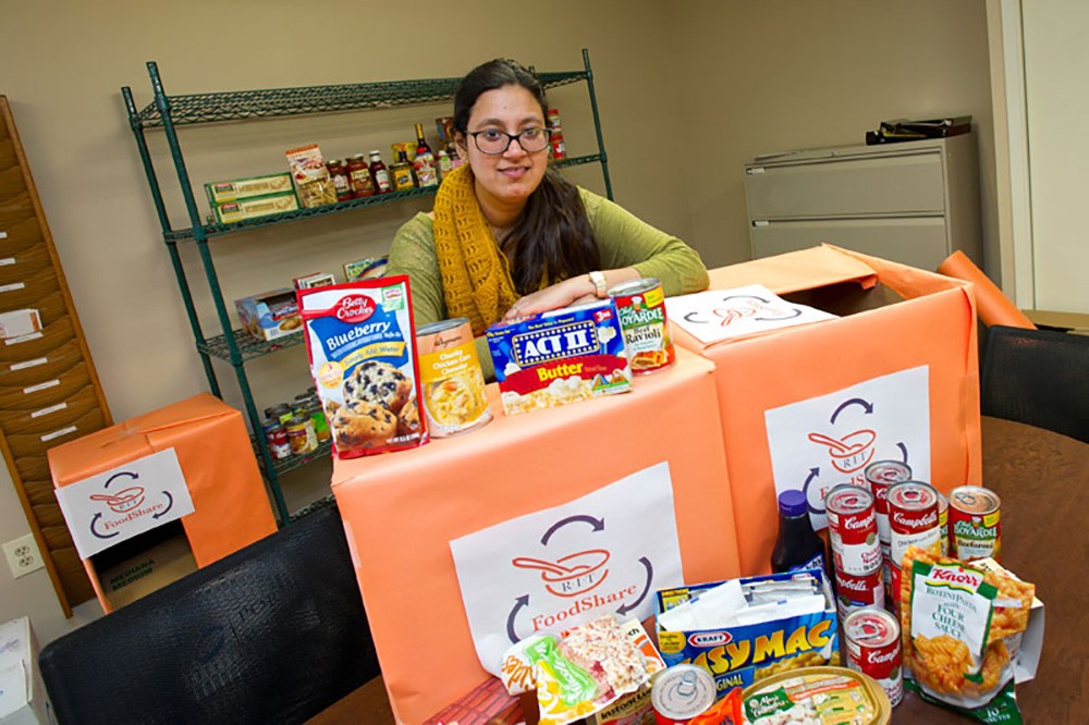 Harshita Sood, an environmental services graduate student from Kolkata, India, helped start the RIT FoodShare Program. Part of the program includes the RIT FoodShare Center, which is expected to open April 13 at the Residence Life Riverknoll office at 113 Kimball Drive. The free items will be available for students who may be having trouble paying for food. -