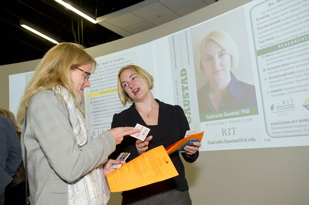 Faculty researchers Risa Robinson, left, from the Kate Gleason College of Engineering, and Gabrielle Gaustad, from the Golisano Institute for Sustainability, were among those who were introduced to “George?” at the Celebration of Research event on Nov. 20. “George?,” the brainchild of Deborah Gears, associate professor of information sciences and technologies, is a digital database and gamified experience that uses scholar trading cards. Using the database, RIT faculty researchers can create their own scholar trading card to be viewed and printed, and view and collect trading cards of their colleagues. The cards feature information that’s useful in building collaborative relationships across campus. Anyone with an RIT user ID and password will be able to view the entire collection and search for keywords of interest. The primary goal is to foster new connections and promote further interdisciplinary research. Visit george.rit.edu to learn more.