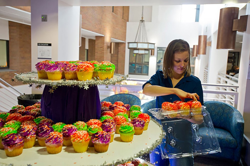 Members of the Women in Engineering program had a birthday bash with colorful cupcakes to celebrate Kate Gleason’s birthday. The college’s namesake, born on November 25, 1865, was a Rochester business leader, entrepreneur, engineer and the first female member of the American Society of Mechanical Engineers. In 1998, RIT’s engineering college was named after her, and in 2010, RIT Press published her biography, The Life and Letters of Kate Gleason, sharing her inspiring story of success. Melissa Miller, a fourth-year industrial engineering student from Belvidere, NJ, arranged some of the 500 cupcakes to honor Gleason.