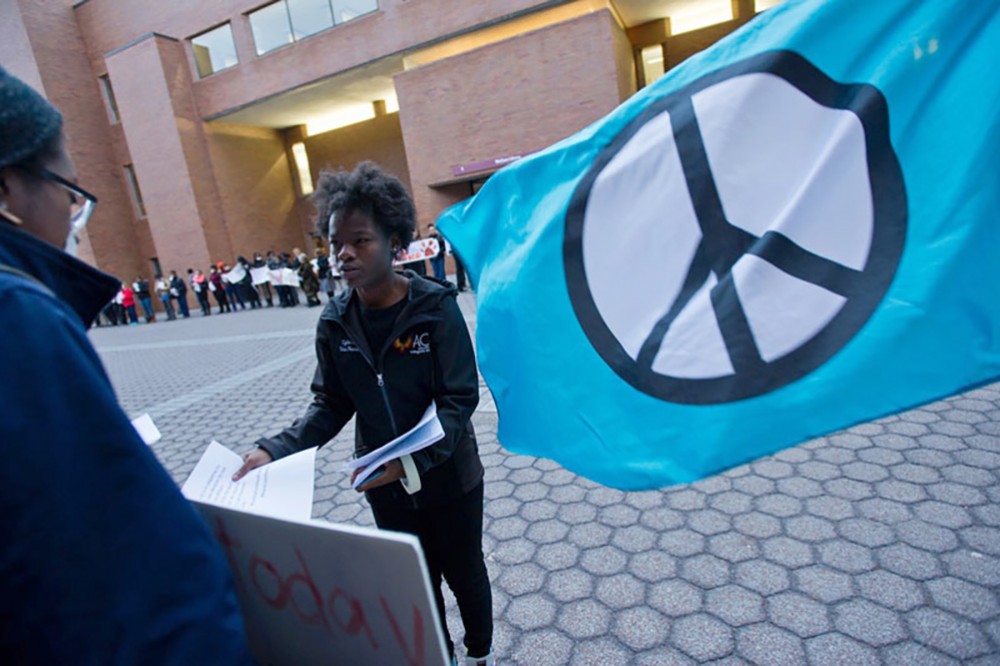 A group of nearly 60 RIT students, faculty and staff held a peaceful, silent protest Nov. 25, the day after a grand jury’s decision not to indict a police officer in the shooting death of an unarmed black teenager in Ferguson, Mo. The protest, held between Wallace Center and Liberal Arts Hall, lasted about two hours. Here, Lydia Moore, a fifth-year packaging science student in the College of Applied Science and Technology, hands out flyers with information.
