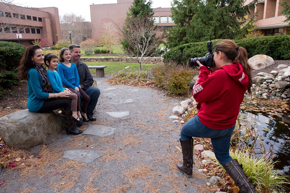 Students from the CIAS Honors Program are offering family and individual portraits for the holidays. The funds collected will contribute to upcoming leadership trips. Here, Michaela Chapman, a third-year fine art photography student, photographs the Emerson-Jeremy family. From 10 a.m. to 4 p.m. Dec. 6-7, the students are available to photograph portraits in Gannett Hall, room 1104. For more information, including pricing and photo delivery, contact Debbie Kingsbury at dlkpgd@rit.edu.