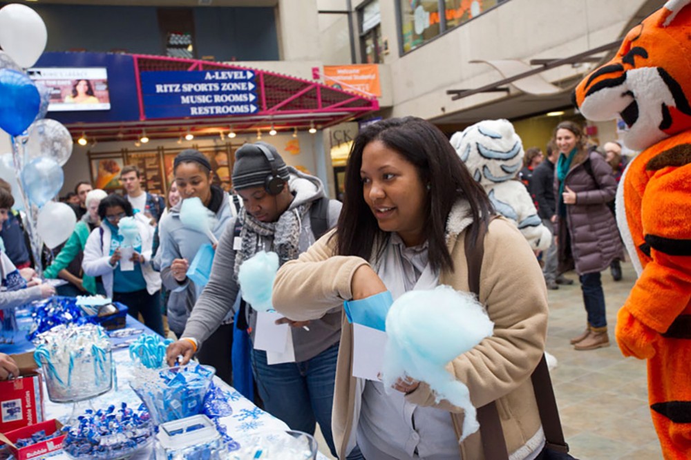 Laura Nunez, a communication and media technologies graduate student from the Dominican Republic, was first in line for the FreezeFest kickoff Dec. 3. The 6th Annual FreezeFest weekend that celebrates winter activities is Feb. 19-22 and features comedian Bo Burnham on Feb. 21.