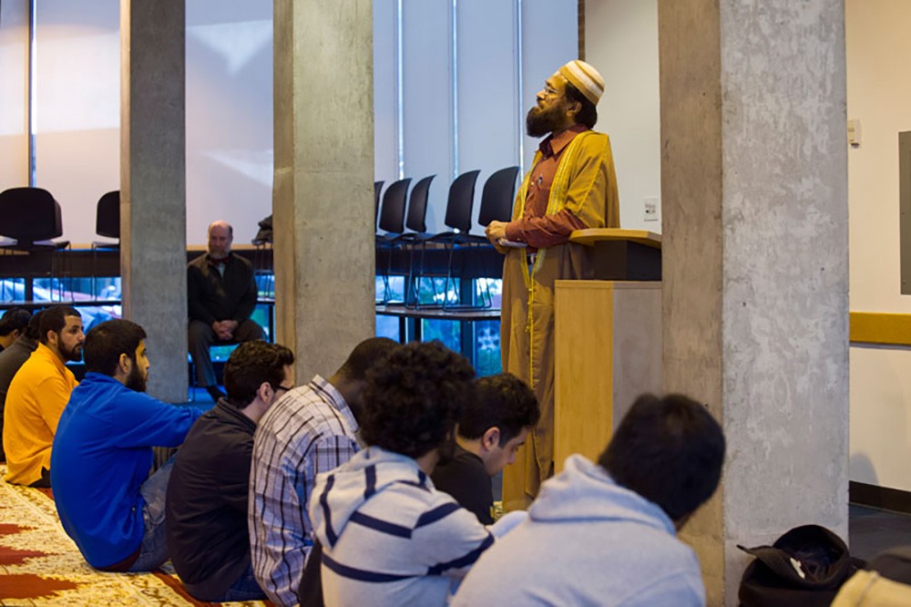 Muslims on campus observe the Friday prayer in the Skalny Room. Muslim Chaplain Rauf Bawany delivered a sermon during the Jumuah Prayer.