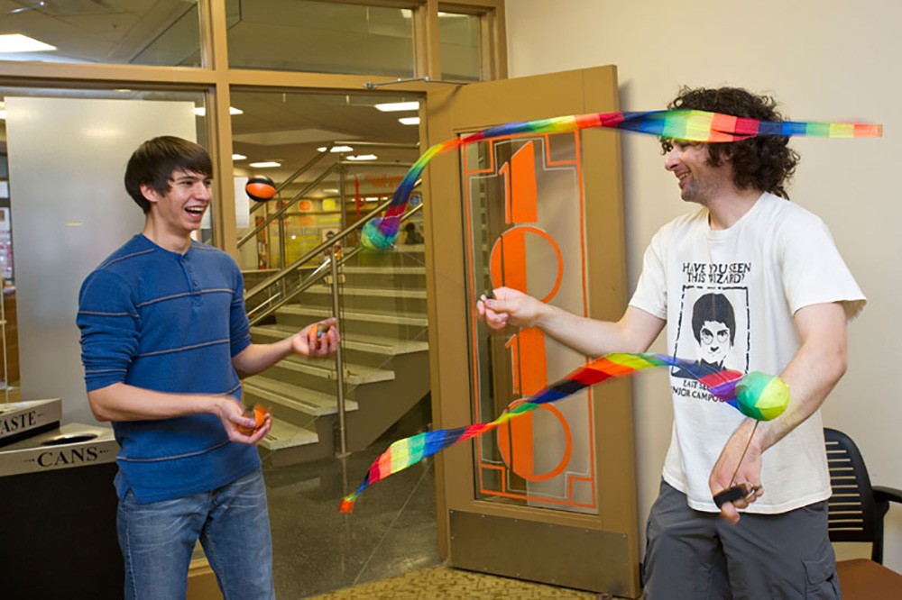 Last week’s Wellness Wednesdays event featured a juggling session on Nov. 5. From left, RIT students Caleb Weeks and Zachary Yaro juggled streamers and balls during the noon hour. The next Wellness Wednesday event, scheduled for 12:10 p.m. Nov. 12 in Campus Center room 1010, is “Perfect Illusions: A Discussion on Body Image.” See more Wellness Wednesday events at rit.edu/studentaffairs/wellness/wellness_wednesdays.php.