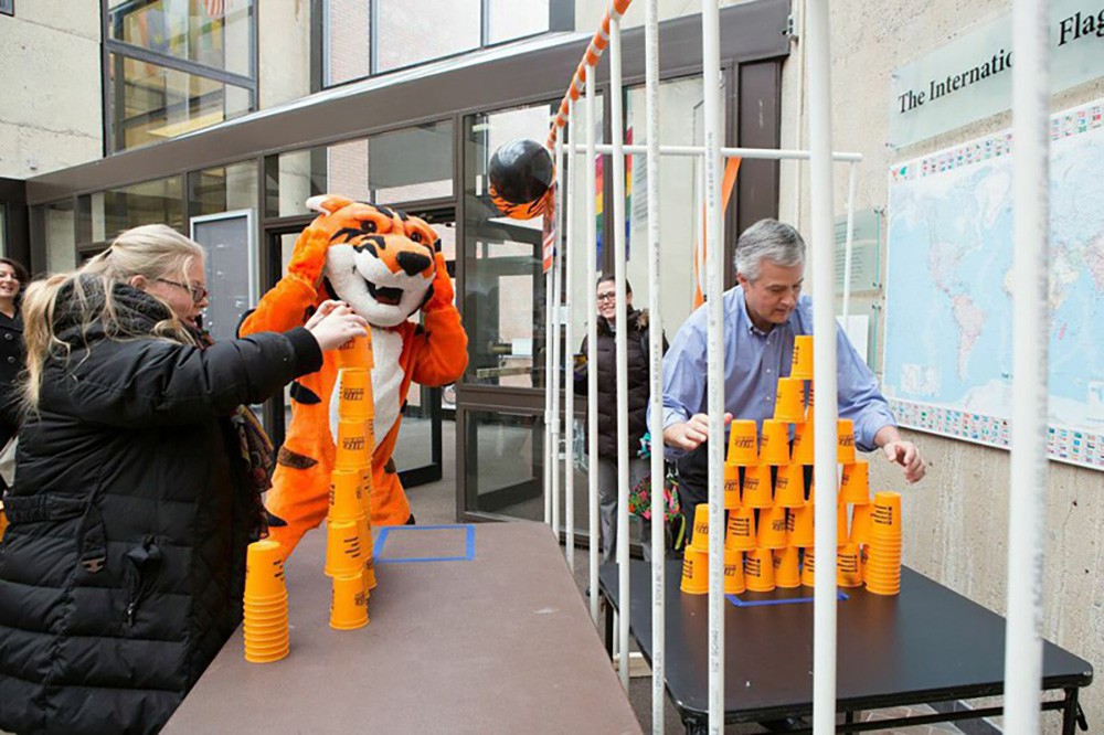Chris Denninger, director of Public Safety, serves time in the Tiger Cage as part of a student charity project. Students Katie Baldwin, Matt Partacz, Kelsey McManus, Mary “Lizzy” Warner and Sara Bjork are working to raise money and awareness to help save tigers. Thirteen notable students and administrators—including President Bill Destler—will spend 20 minutes in a cage from 11 a.m. to 3 p.m. today in the SAU lobby. Passers-by can play minute-to-win-it games against the captives to keep them in the cage longer. To read more, go to www.rit.edu/news/story.php?id=51088.