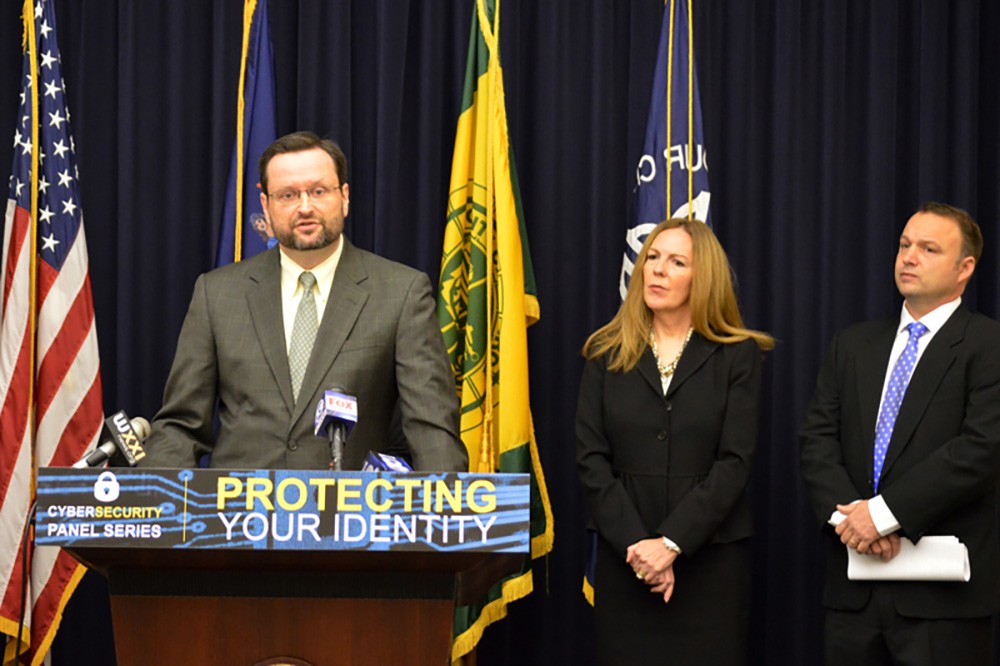 Andrew Sears, left, dean of the B. Thomas Golisano College of Computing and Information Sciences, spoke at a news conference Nov. 12 announcing a three-part Cybersecurity Panel Series, hosted by Assembly Majority Leader Joseph D. Morelle and County Legislator Justin F. Wilcox, right. The panel series aims to educate consumers and business owners about cybersecurity threats and the strategies for protecting identities and assets. “RIT is delighted to partner with Majority Leader Morelle and County Legislator Wilcox to showcase our nationally-recognized computing security program that is turning out highly-qualified graduates who pursue a variety of careers in cybersecurity,” said Sears. “We are committed to preparing a new generation of talented cybersecurity professionals who have the skills—and the ethics—necessary to protect our public and private sectors from online threats.” RIT will host the third and final panel in the series. Also pictured is District Attorney Sandra Doorley.