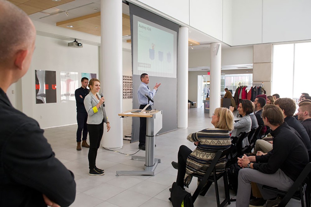 RIT industrial design students presented their creations during judging for Metaproject 05, held at the University Gallery on Nov. 18. This year, the Metaproject partnership is with Kikkerland and Bed Bath & Beyond. Kikkerland is an international hub that designs, produces and markets original products in a variety of consumer categories such as gift, stationery and housewares. Bed Bath & Beyond is a national retail chain that specializes in the home furnishings categories. Center, Audrey Kirk, a third-year industrial design student from Ontario, Canada, spoke about her project.