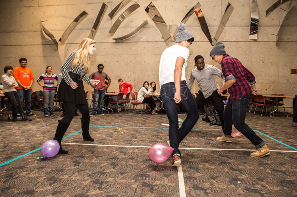 Students gathered to play international games on Nov. 18 as part of International Education Week, a joint initiative of the U.S. Department of State and the U.S. Department of Education to promote programs that prepare Americans for a global environment and attract future leaders from abroad to study, learn and exchange experiences in the United States. This year’s activities are sponsored by the College of Liberal Arts’ Department of Modern Languages and Culture, the English Language Center, Global Union, International Student Services and RIT Global. From left, Emily Beagles, Jay Park, Andrew Lanos and Tousif Chowdrey play a balloon game by popping balloons with only one foot. A full schedule of events is available online.