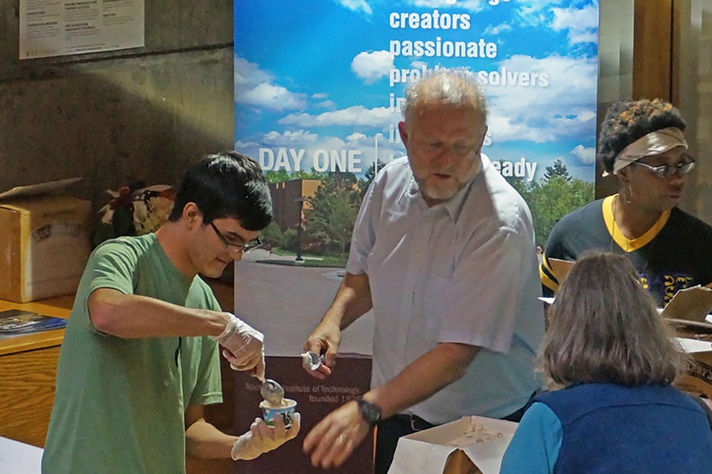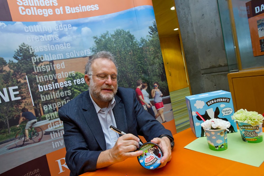 Jerry Greenfield dishes out his namesake ice cream after delivering the Saunders College of Business’ Gasser Lecture Series Oct. 17. High school friends Greenfield and Ben Cohen started Ben & Jerryâs in 1978. Greenfield and Cohen sold Ben & Jerryâs to Unilever in 2000 and they remain employed by the company. Greenfieldâs lecture, âAn Afternoon of Entrepreneurial Spirit, Social Responsibility and Radical Business Philosophy,â was followed by a booksigning (Ben & Jerryâs Homemade Ice Cream & Dessert Book) and free scoops of Ben & Jerryâs Cookie Dough, Cherry Garcia or Chocolate Therapy ice cream. -