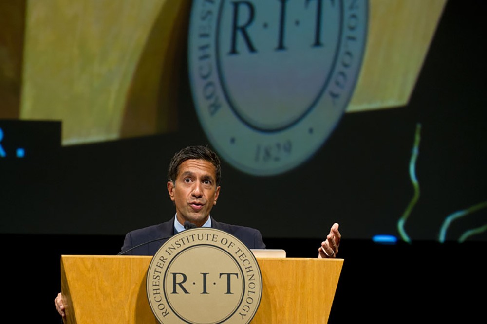 RIT welcomed respected neurosurgeon, CNN Chief Medical Correspondent and Emmy-award winning journalist Dr. Sanjay Gupta as this yearâs Horton Distinguished Speaker Oct. 18 in the Gordon Field House and Activities Center, part of Brick City Homecoming & Family Weekend. -