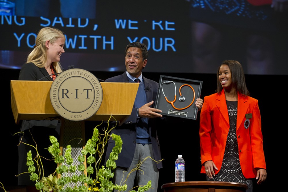 Dr. Sanjay Gupta, CNN’s Chief Medical Correspondent, spoke Oct. 18 as the RIT Student Government Horton Distinguished Speaker at RIT’s Brick City Homecoming & Family Weekend. Kathryn Davis, director of programming for Student Government, and Ashley Carrington, Student Government president, presented the practicing neurosurgeon with an RIT orange stethoscope. -