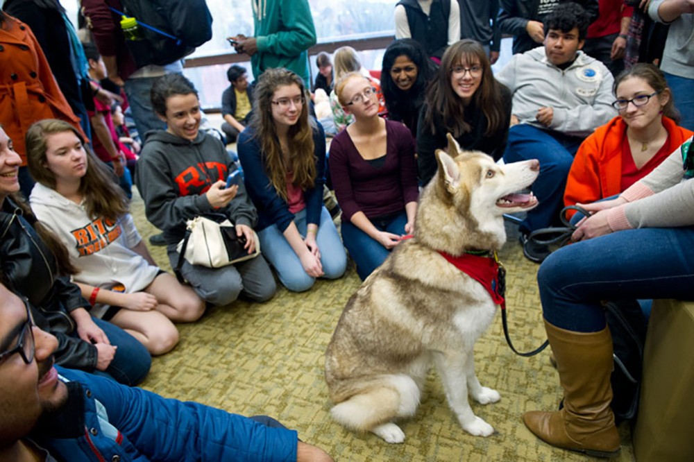 There was lots of love at the Bow Wow Wellness event. The Center for Student Wellness arranged for the therapy dogsâ visit to campus as a stress reduction activity on Oct. 23. Research indicates that pet therapy improves psychological well-being and self-esteem. The next chance to see the dogs is Nov. 13, 4:00-5:30 p.m. in Fireside Lounge. -