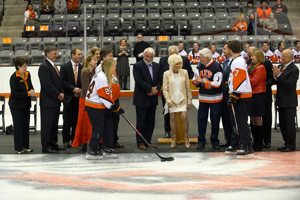 Hundreds of hockey fans celebrated the opening of the Gene Polisseni Center on Sept. 18. Wanda Polisseni, the wife of the late Gene Polisseni, the arenaâs namesake, dropped the first puck. RIT President Bill Destler, members of the Polisseni family, Tom Golisano and Steve and Vicki Schultz participated in the dedication ceremony, along with menâs head coach Wayne Wilson, womenâs head coach Scott McDonald, team captains, the Corner Crew and Ritchie. Festivities included self-guided tours, open skate and RIT hockey trivia. The $38 million, 112,000-square-foot, state-of-the-art arena has a total capacity of 4,300 fans and features exclusive seating options, two full-service concession stands, a new RIT Athletics Hall of Fame and a Barnes and Noble store where fans can purchase Tiger gear. For more on the arena, go to rit.edu/news/polisseni.php. -