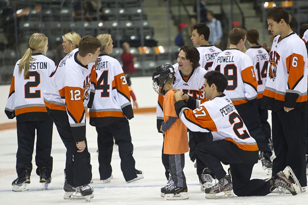 A young RIT hockey fan had his T-shirt signed by Alex Perron-Fontaine at the Gene Polisseni Center opening Sept. 18. RIT President Bill Destler, members of the Polisseni family, Tom Golisano and Steve and Vicki Schultz participated in the dedication ceremony, along with menâs head coach Wayne Wilson, womenâs head coach Scott McDonald, team captains, the Corner Crew and Ritchie. Festivities included self-guided tours, open skate and RIT hockey trivia. For more on the arena, go to rit.edu/news/polisseni.php. -