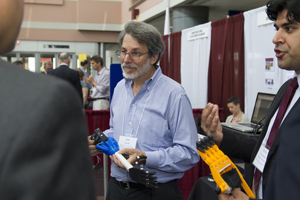Jon Schull, a research scientist in RITâs MAGIC Center, demonstrates a 3D-printed prosthetic hand and forearm during the Effective Access Technology Conference June 17 at the Rochester Riverside Convention Center. The two-day conference featured speakers, exhibits and poster sessions on ideas and innovative solutions to the challenges in applying technology to improve access for people with a variety of disabilities. Schull created e-NABLE, an online community of 3D printing hobbyists that works to custom design, improve and create affordable prosthetics. -