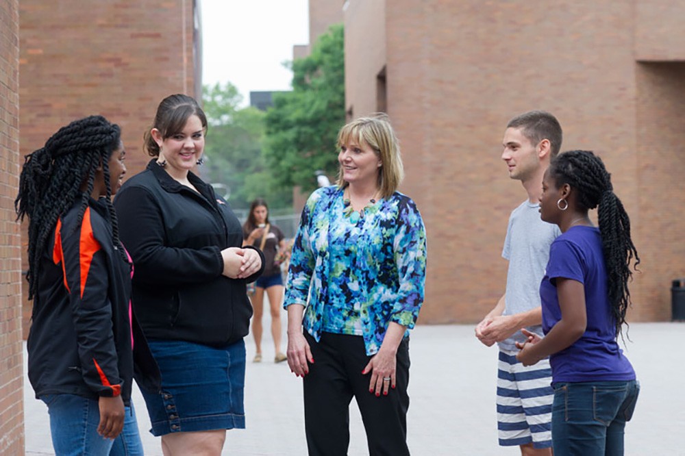 Sandy Johnson assumed the post of senior vice president for student affairs on July 1. Johnson comes to RIT having served for nearly eight years as vice president for the Division of Student Affairs at Hofstra University. At home, she is currently in âunpacking mode,â having recently moved to the Rochester area with her family. Johnson had a chance to meet a few RIT students who were on campus this week. From left, Jasmine Tompkins, Paige Satterly, Johnson, Vasilios Anton and Lydia Moore. To read a Q&A with Johnson, go to www.rit.edu/news/athenaeum_story.php?id=50672. -