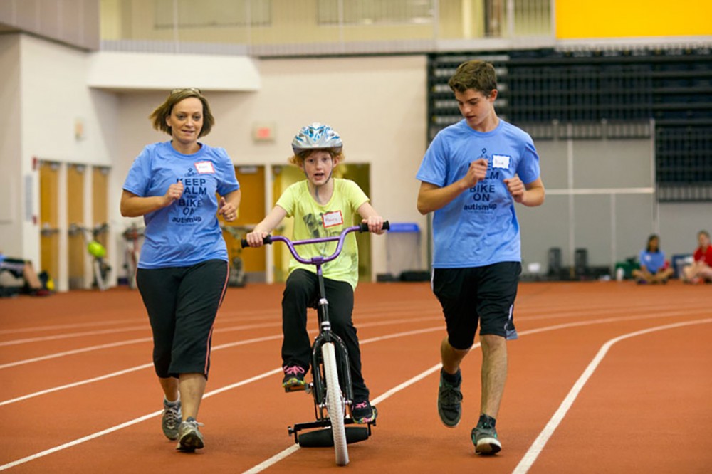The seventh annual AutismUp iCan Bike Camp is July 7-11 at the Gordon Field House. The camp teaches individuals with Autism Spectrum Disorder and other disabilities how to ride a conventional bike without training wheels. Lose the Training Wheels provides specialized bicycle riding equipment, as well as a team of experts. Here, 10-year-old Maura Miles gets support from volunteers Robin Donnelly and Noah Henry. -