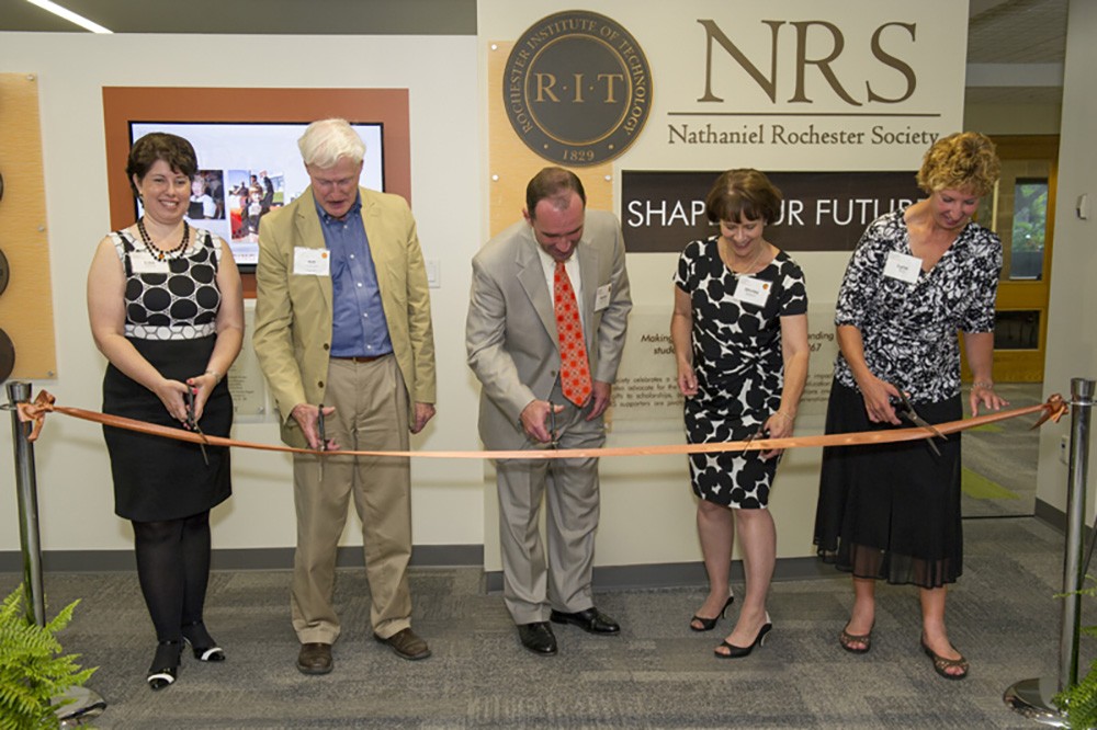 One of the highlights of last Thursdayâs Nathaniel Rochester Society Gala was the dedication of the new NRS Honor Wall on the first floor of The Wallace Center. The mission of NRS is to develop friends and ambassadors to promote and support RIT, and the wall recognizes the more than 970 members of the organization. Cutting the ribbon are, from left, RIT Vice President of Development and Alumni Relations Lisa Cauda, President Bill Destler, NRS Executive Committee Chair Patrick Talty, Library Director Shirley Bower and Associate Provost for Faculty Development and The Wallace Center Lynn Wild. Some 250 people attended the gala, held July 10 at The Wallace Center. -