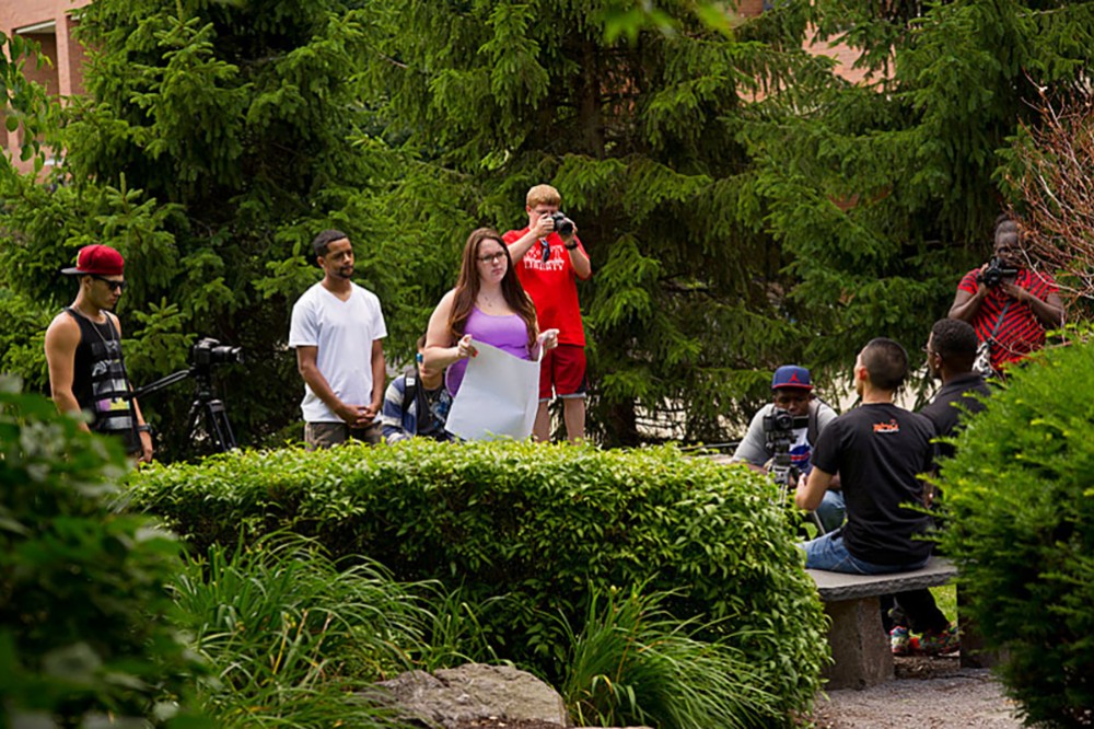 A one-week summer camp this week on video production was part of RITâs Liberty Partnerships Program with Greece Olympia High School. Here, Justin Ortiz, second from left, worked with students to interview owners of Phu Concepts, a Rochester marketing company. Ortiz is the executive director of Generation News and was the facilitator of the media camp. RITâs Liberty Partnerships Program is part of the New York State Education Departmentâs Statewide Plan for Higher Education. -
