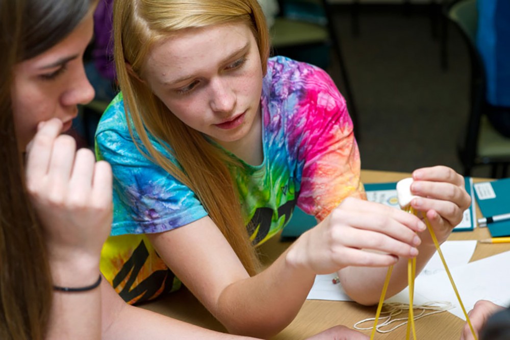 RIT held a two-day engineering event for young high school women July 17-18. WE Explore included an engineering activity, lectures and inspirational sessions on how engineering impacts society. The marshmallow challenge was a 15 minute exercise to create the tallest freestanding structure with a marshmallow on top using only 20 sticks of spaghetti, one yard of tape, one yard of string and one marshmallow. From left, Courtney Russo and Erin Smith work on their project with their other teammates. -