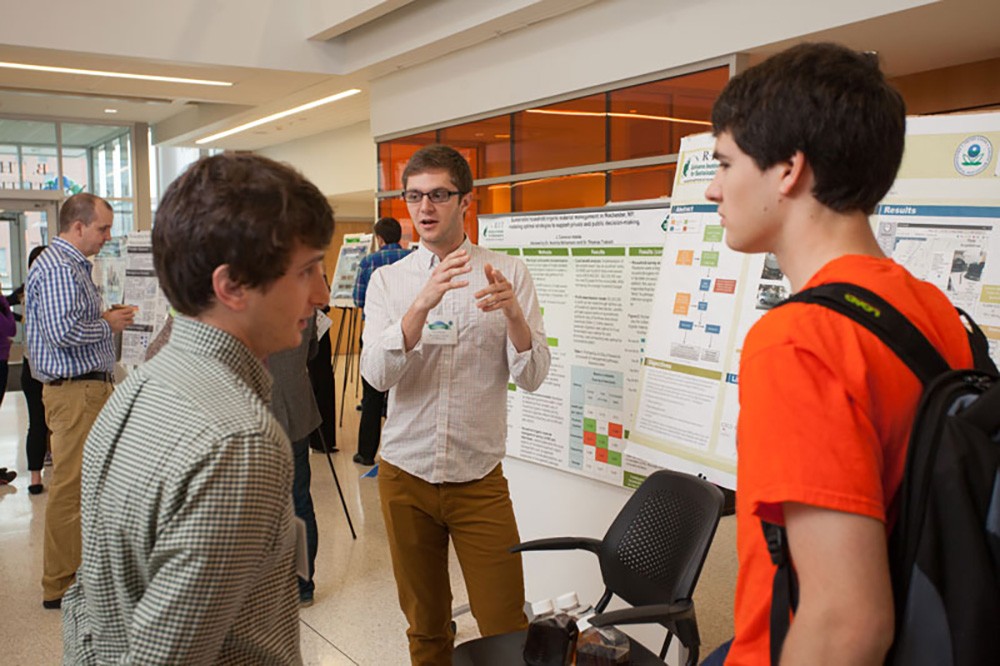 Three student teams from RIT were among 13 teams from nine colleges competing in the third annual NYSP2I Research and Development Student Competition. The New York State Pollution Prevention Institute challenged teams of full-time students enrolled at any institute of higher education in New York state to identify a specific activity at their university or in their community with a large environmental footprint. Teams were then required to design innovative solutions to reduce the issue’s impact. The teams presented their ideas at the Golisano Institute for Sustainability on April 22 as part of an Earth Day celebration.