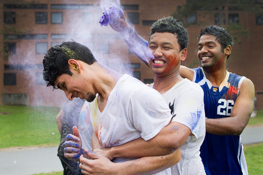 Holi, a celebration of spring, was part of SpringFest sponsored by OASIS April 26. The festival symbolizes love and colors by singing and dancing with dry colored powder and water. From left, RIT students Hassan Jehan, Jayjeet Gohain Baruah and Devansh Punjala.