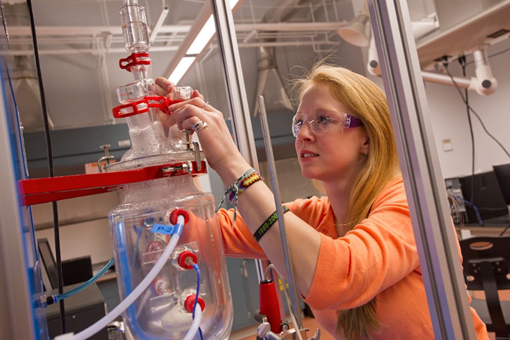 Shannon McCormick â13 makes adjustments to an isothermal reactor in one of the state-of-the-art labs in Institute Hall, home of RITâs new chemical engineering program.