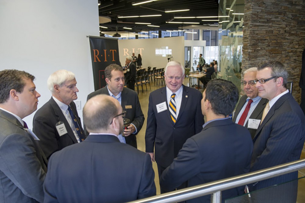 A roundtable titled âGrowing Computer and Video Game Development in New York,â was held Oct. 22 at RIT to gather comment from interactive entertainment leaders, entrepreneurs and legislators on how New York state can attract and support the video game design and development industry. The session was hosted by New York State Sen. Martin Golden (R-Brooklyn), chairman of the Senate Select Committee on Science, Technology, Incubation and Entrepreneurship. Pictured here are RIT President Bill Destler, MAGIC Center Director Andrew Phelps and Golden. -