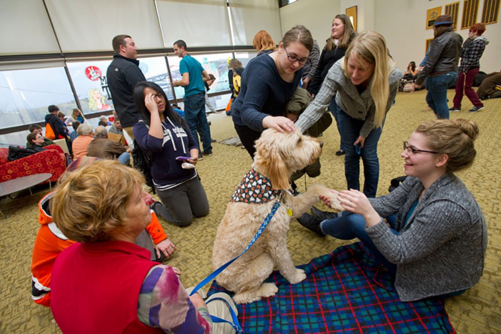 Owners with their certified therapy dogs provided a welcome break for RIT students in the Fireside Lounge Oct. 25. Here, Mike and Barbara Serveâs goldendoodle, Tucker, gets attention from students. The event was sponsored by Student Wellness as a stress reduction activity. Research indicates that pet therapy improves psychological well-being and self-esteem. -
