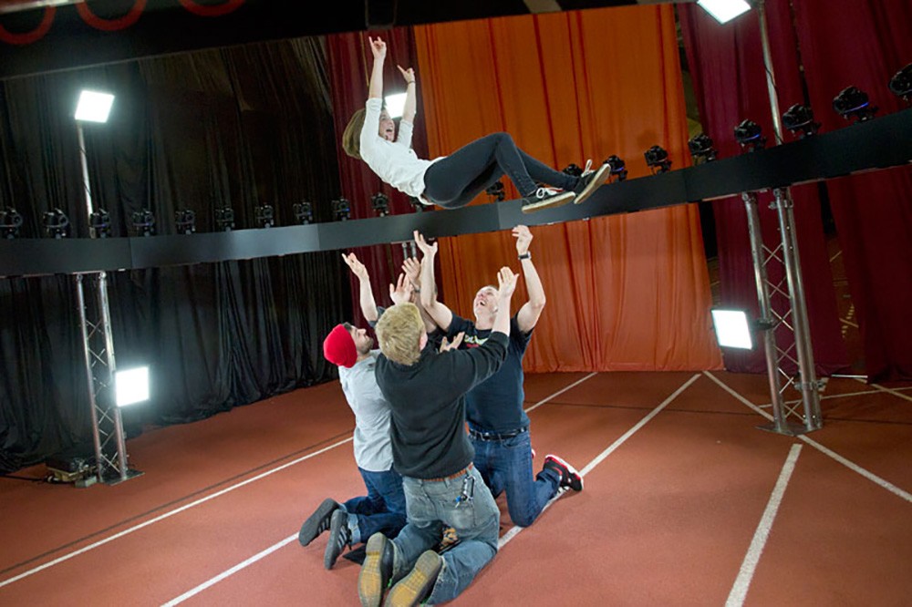 Robert Latorre, an RIT alumnus, created The Big Freeze Worldwide, which is the most advanced Camera Array System in the world. The system is now in its 5th generation and has been used in feature films, commercials, and on the Red Carpet. Here, RIT student Lia DiRico and friends test it out in a demonstration after Latorre gave a talk on campus. -