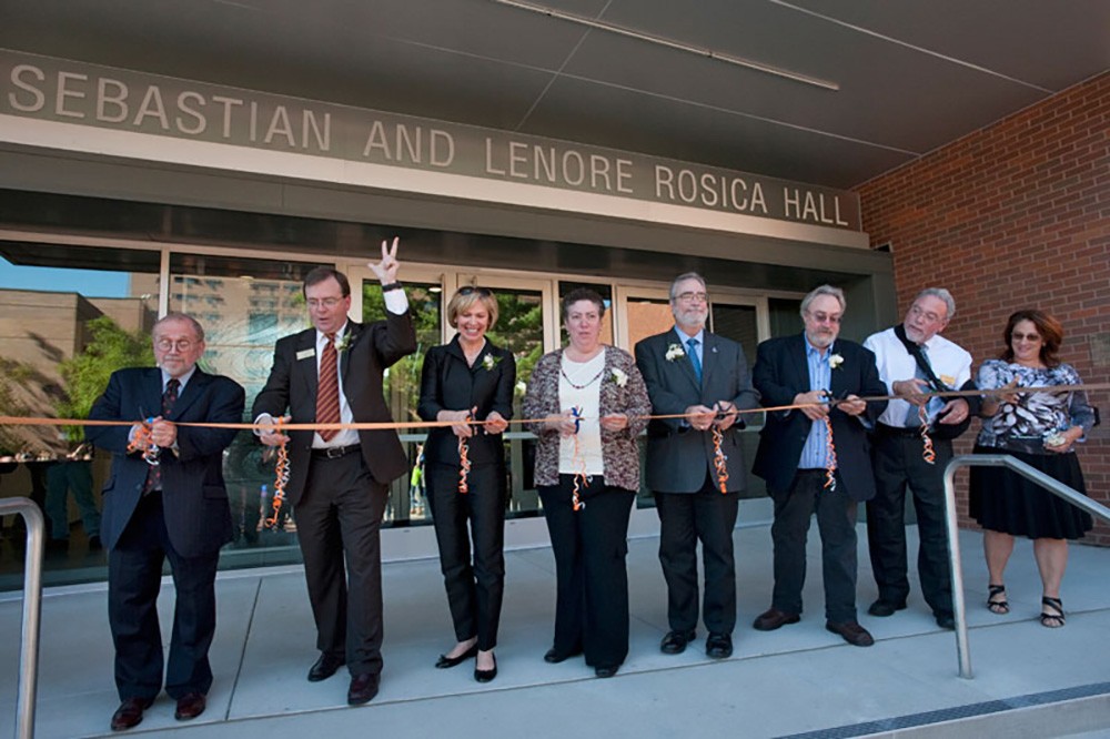 A grand opening and ribbon cutting ceremony for Sebastian and Lenore Rosica Hall was held Oct. 11. Cutting the ribbon are RIT Professor and NTID Dean Emeritus Jim DeCaro, NTID President and RIT Vice President and Dean Gerry Buckley, Diana Spencer, executive director of the William G. McGowan Charitable Fund, who provided a $1.75 million naming gift, and members of the Rosica family. -
