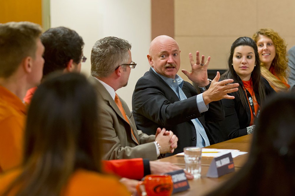 Leaders from RITâs Student Government met with astronaut Mark Kelly as he shared stories during a roundtable discussion on Oct.12. Kelly and former U.S. Representative Gabrielle Giffords spoke as this year's Student Government Horton Distinguished Speakers during RITâs Brick City Homecoming & Family Weekend. -