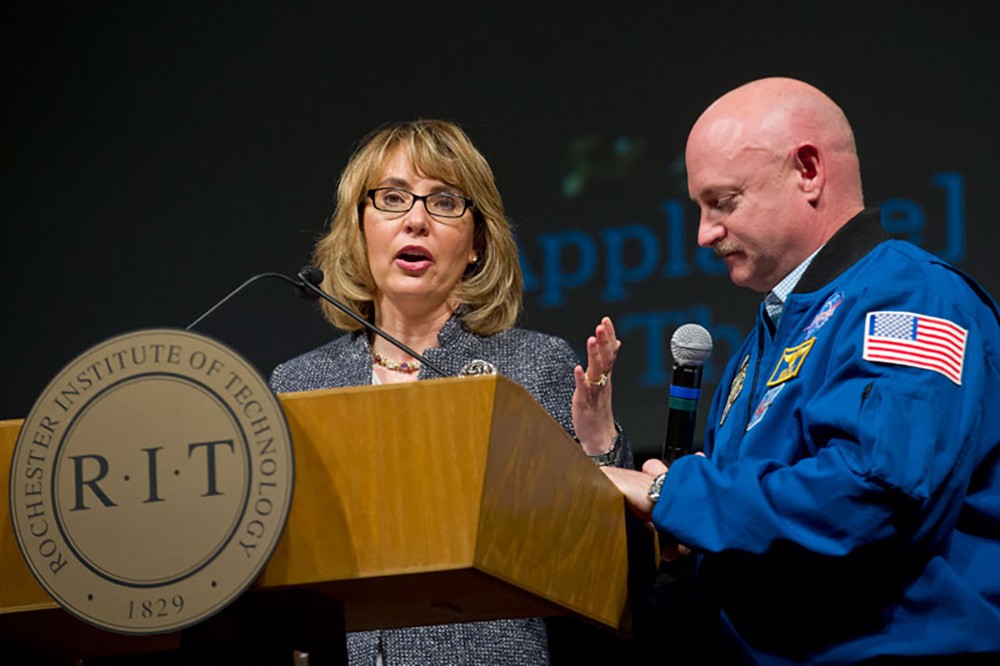 RIT welcomed astronaut Mark Kelly and former U.S. Rep. Gabrielle Giffords as this yearâs Horton Distinguished Speakers Oct. 12 in the Gordon Field House and Activities Center, part of Brick City Homecoming & Family Weekend. -
