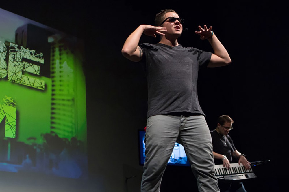 RIT/NTID alumnus Sean Forbes â08 performed his unique brand of hip-hop/sign music on Oct. 11. -
