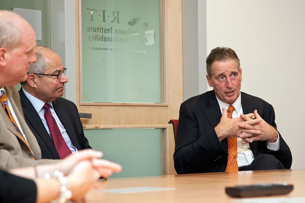VisitRochester, the official tourism organization for Greater Rochester, hosted several executives from New York City last week and made a trip to RITâs Golisano Institute for Sustainability. The group included Mark Jaffe, left, president of the New York City Chamber of Commerce, and New York Lt. Gov. Robert Duffy â93 (multidisciplinary studies). Nabil Nasr, associate provost and director of Golisano Institute for Sustainabilty, is seated in the middle. -