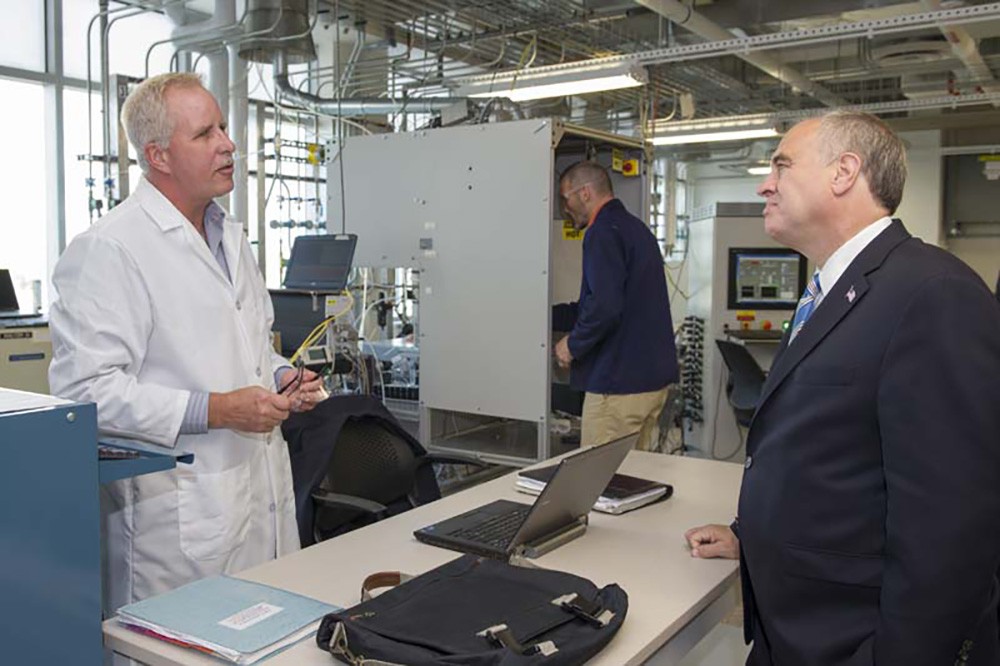 Dan Smith, a senior project manager in the Center for Sustainable Mobility in the Golisano Institute for Sustainability, discusses the labâs capabilities with New York State Comptroller Thomas DiNapoli. DiNapoli visited RIT Oct. 1, including the universityâs business incubator, Venture Creations, to promote a program for seed funding for start-up companies. -