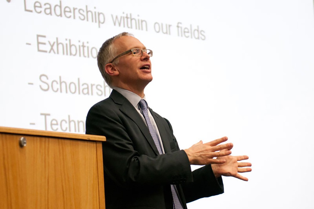 Bruce Barnes, the Ron and Donna Fielding Director of George Eastman House, discussed the future of the Rochester landmark in the first installment of the 2013-2014 William A. Kern Lecture Series at RIT on Sept. 19. The Kern lecture series, sponsored by an endowment from RITâs William A. Kern Professorship in Communications in the College of Liberal Arts, provides an opportunity for scholarly discussion surrounding contemporary communication issues. -