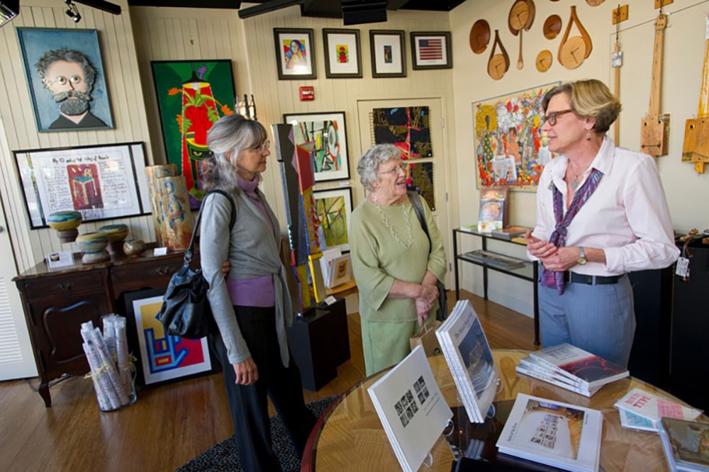 Barbara Cowles, center, manager of the original and iconic Shop One (1953-1977), visited Shop One2 in Global Village on Sept. 27. She shared stories with artist Laura Wilder, left, and Wendy Marks, Shop One2 manager, about her husband, Hobart Cowles, professor of ceramics at the School for American Craftsmen (now the School for American Crafts) from 1951 to 1980. -
