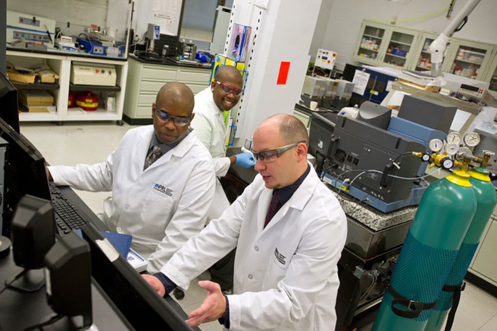 Brian Landi â02, â06, right, leads research in the Nanopower Research Labs in addition to teaching in the chemical engineering program. He mentored Reginald Rogers, left, who was a post-doctoral researcher in the lab, and recent chemical engineering graduate Garry Clarke. Rogers became a full-time, tenure-track faculty member in 2012 and Clarke began work in Philadelphia in June as a process engineer. -