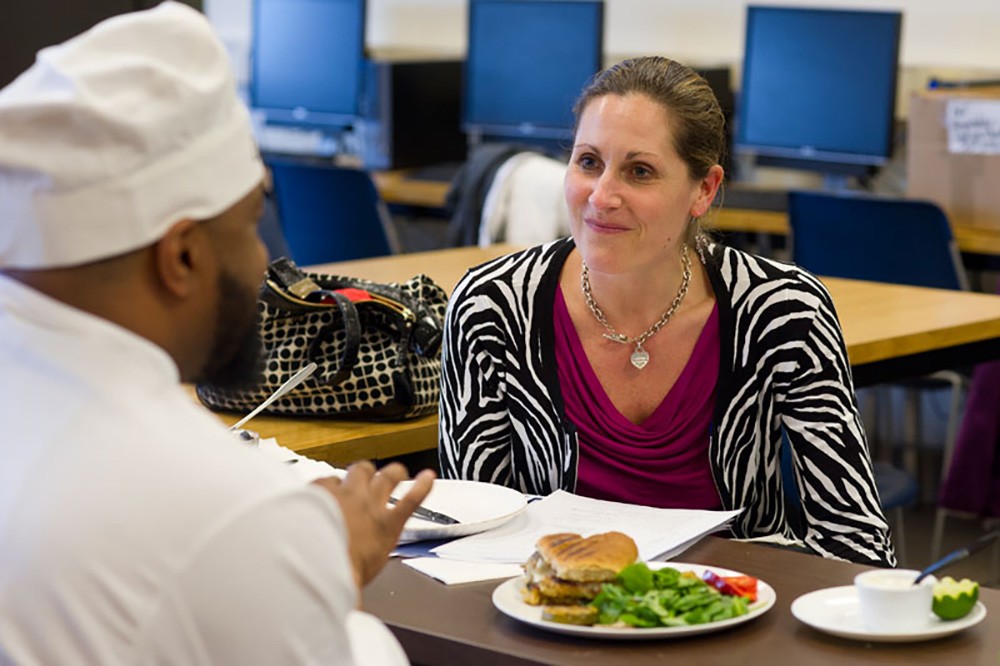 Kenneth Williams, left, presented his Persian Lime Chicken Burgers to Elizabeth Olsson â95 during his product development class. Students are using olive oils and vinegars provided by Flower City Olive Oil, a company co-owned by Olsson. The students will provide Olsson with recipes that the company will post on their website.
