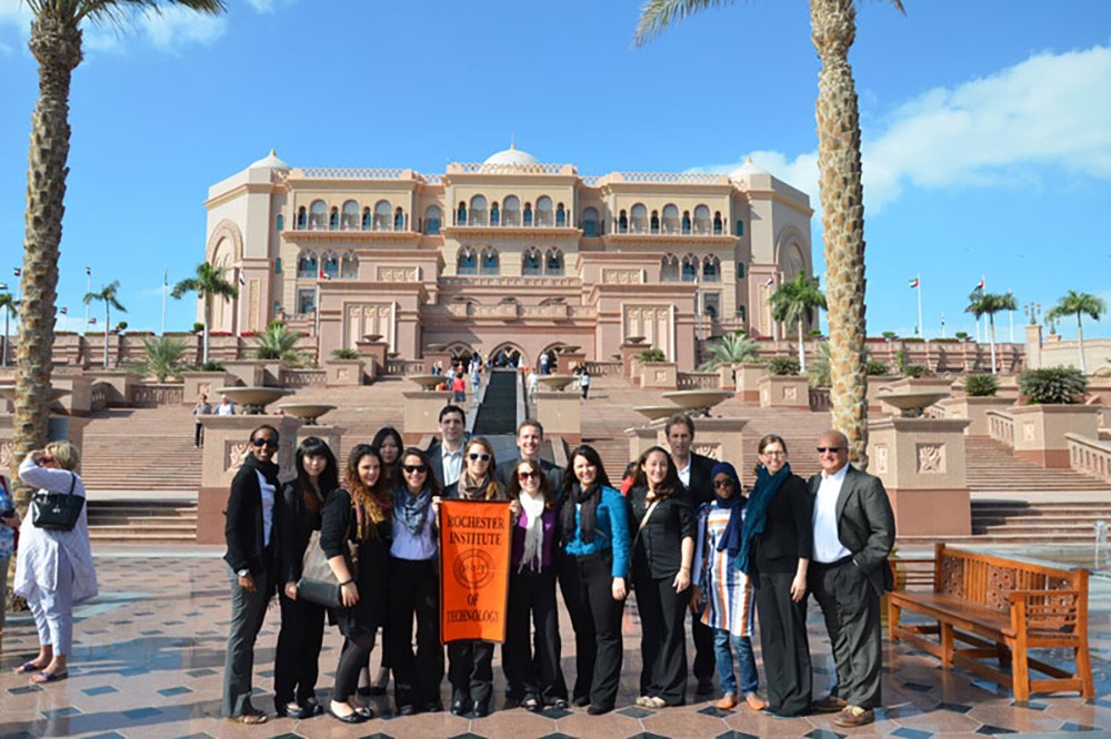Each winter break, students from the School of International Hospitality and Service Innovation travel to Dubai to meet general managers and human resource professionals at some of the most opulent and prestigious resorts and businesses, including the Palace Hotel, in the center of the city. It is a chance for the students to learn more about service management and the hospitality industry from experts in the field. Pictured are (left to right) students Obah Youssouf, Xiaohan Meng, Danielle Fanara, Jing Lu, Jillian Lynch, Michael Gioja, Emily Gosier, Christopher Russell, Danielle Sanderson, Katie Markowitz, faculty Rick Lagiewski, students Amina Mareh and Brittany Comenga and faculty Warren Sackler. -